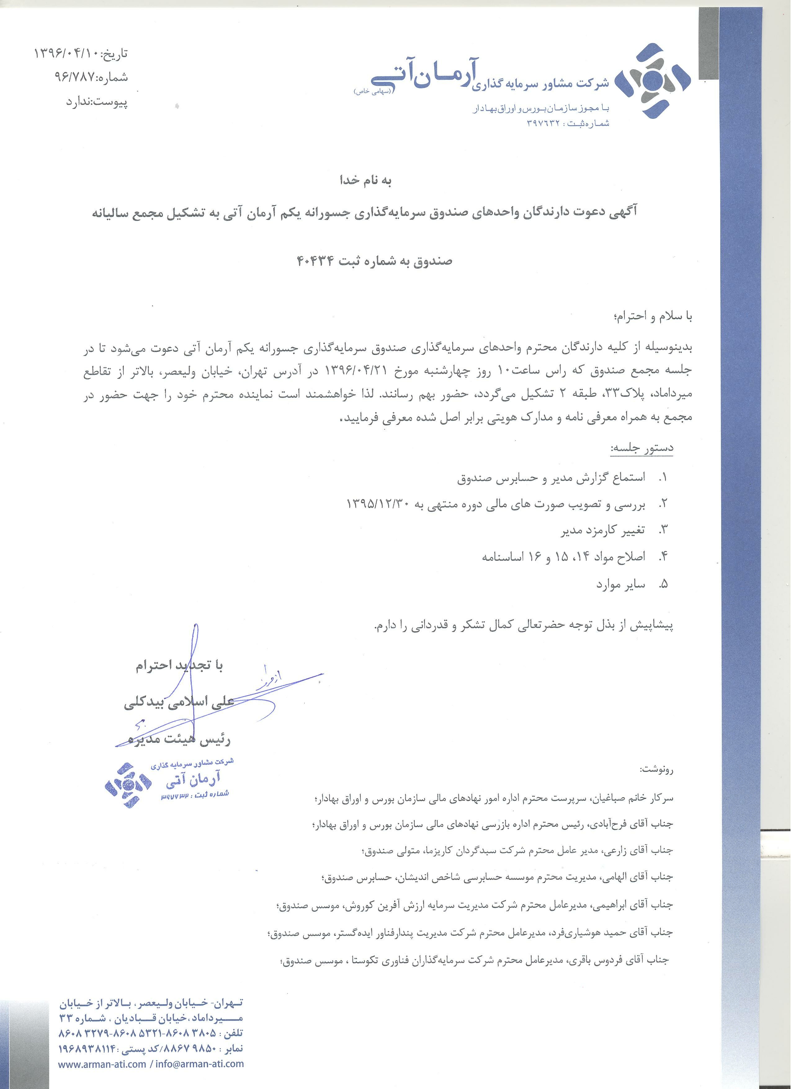 اصلاحیه آگهي دعوت به مجمع صندوق سرمايهگذاري جسورانه يکم آرمان آتي در تاريخ ۱۴۰۴/۰۳/۱۰- مجمع سالانه