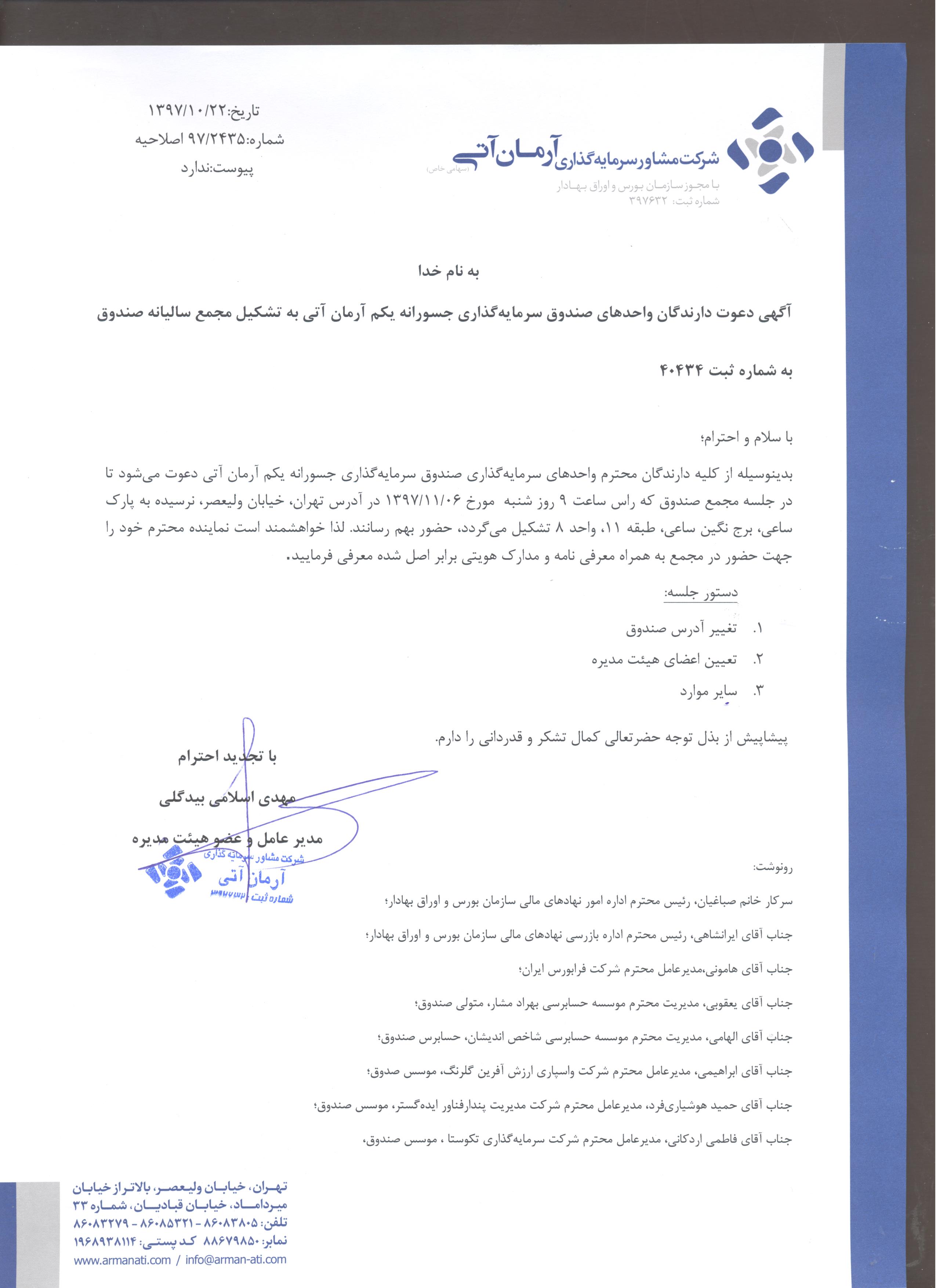 اصلاحیه آگهي دعوت به مجمع صندوق سرمايهگذاري جسورانه يکم آرمان آتي در تاريخ ۱۴۰۴/۰۳/۱۰- امیدنامه ای